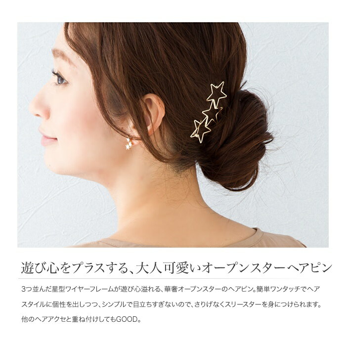 3つ並んだ星型ワイヤーフレームが遊び心溢れる、華奢オープンスターのヘアピン。