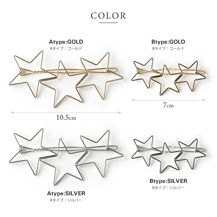 【ゆうパケットOK】遊び心をプラスする、大人可愛いオープンスターヘアピン サイズ モチーフの大きさ:Aタイプ/10.5cm×5.0cm (ピン:9.1cm)、 Bタイプ/7.0cm×3.6cm (ピン:6.2cm) 素材 合金(brass) 注意点 ■モニターの都合上、掲載写真と実際の色が異なる場合がございます。