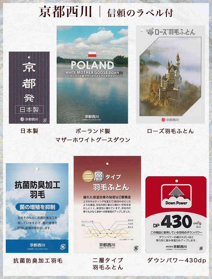 優れたかさ高性を持ち、保温性、弾力性に富んだ 高品質のポーランド産ホワイトマザーグースダウンを使用した、京都西川の高級羽毛掛布団です。